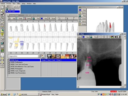 State-of-the-art three-dimensional graphical dental charting and imaging program. The product included innovated features such as voice activated data input as well as digital x-ray and digital periodontics chart tracking systems. The dental images were real time 3-D images which could be individually rotated to see all sides of the dental image.